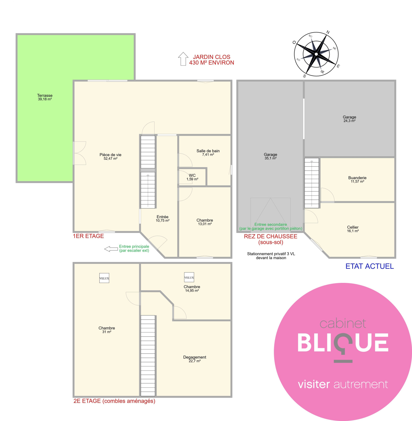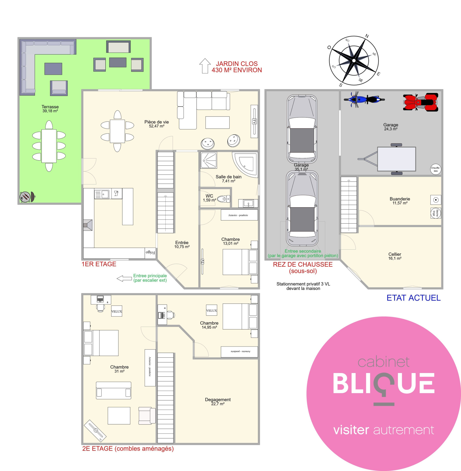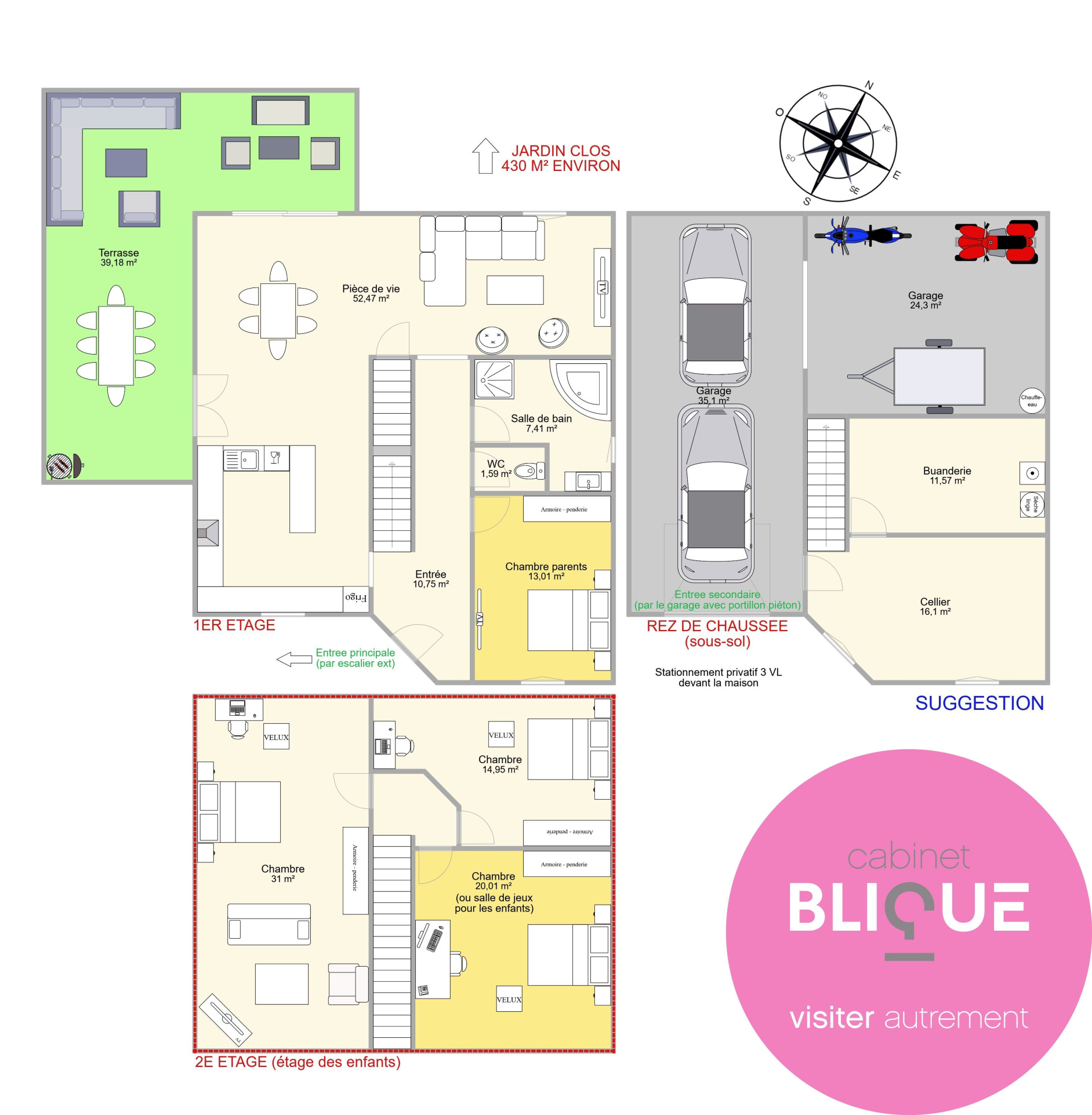 La pièce de vie ? Un vaste terrain de jeu de plus de 50 m² avec sa cuisine ouverte et sa terrasse attenante de 39 m² avec enrochement, parfaite pour les barbecues improvisés ou les pauses café en robe de chambre. Les trois chambres n’ont rien à envier aux suites d’hôtel (13, 15 et 31 m², rien que ça), et l’étage réserve une jolie surprise : un espace de 23 m² à aménager selon vos envies les plus folles (salle de jeux ? bureau ? 4e chambre ?). Ou un étage complet dédié aux enfants ? Voir plans photos N°10 et 11.